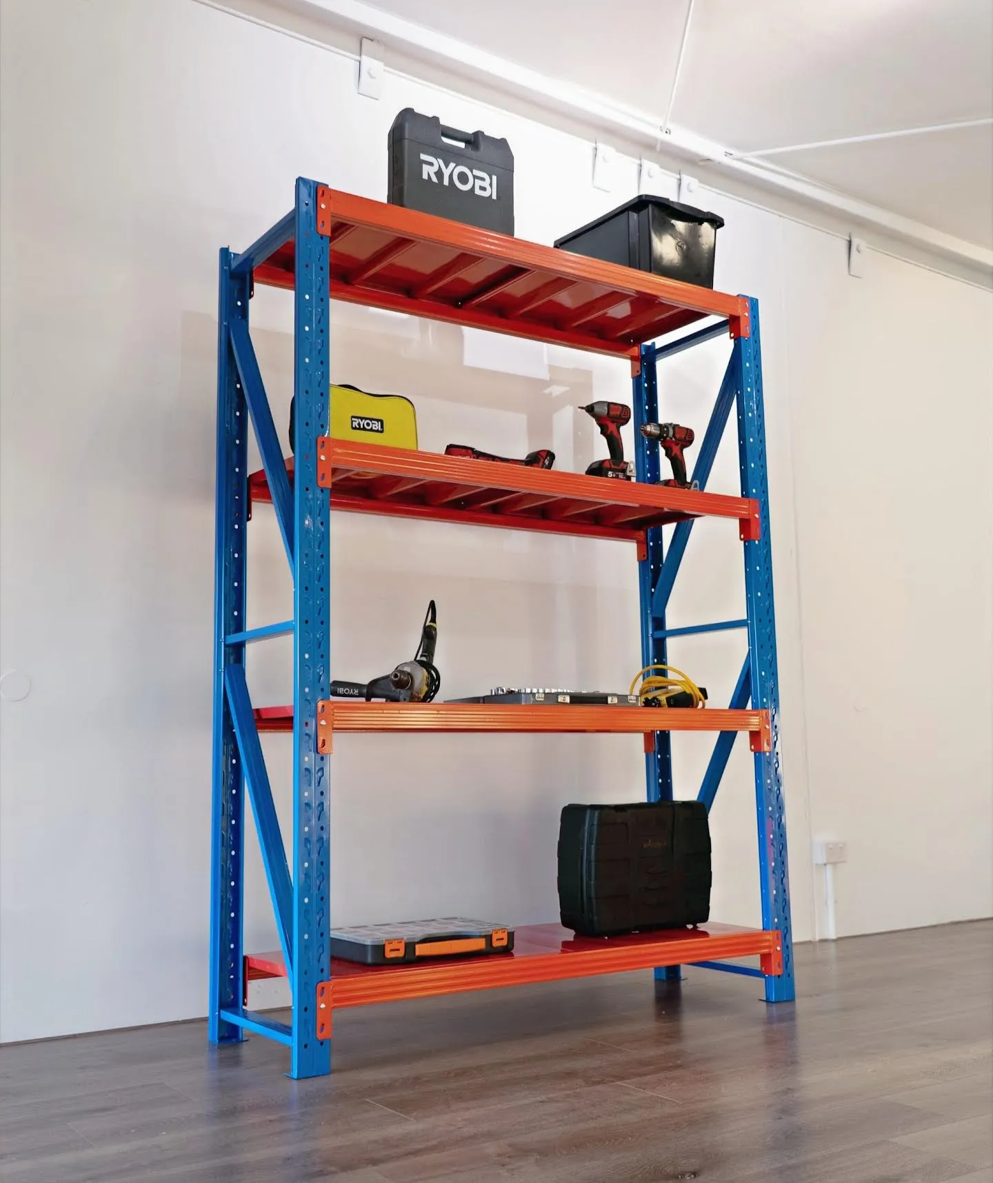 Heavy duty steel shelves free up more space, improve accessibility, and create a cleaner, more organised garage.